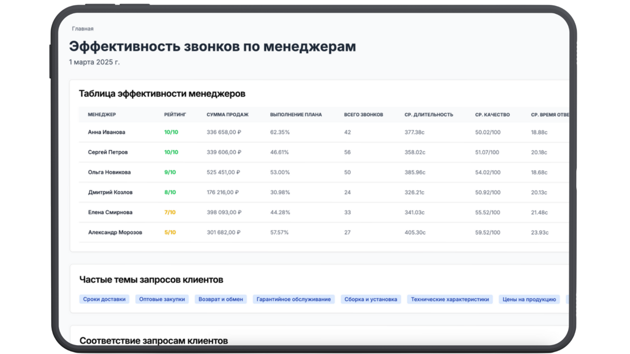 Менеджеры ежедневно получают рекомендации по улучшению своих навыков. Компания получает отчеты о потребностях клиентов и возражениях.